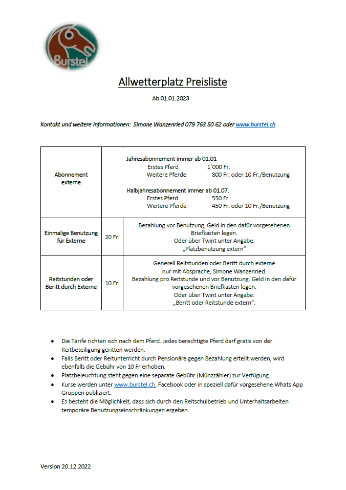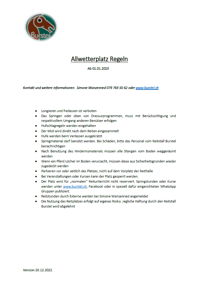 Die Reitsportanlage Burstel liegt ausserhalb vom Industriegebiet Möhlin und grenzt an das Waldgebiet Forst und an die „Möhliner Höhe“. Die Umgebung bietet viele Möglichkeiten für lange Ausritte. Zum ganzen Areal gehören insgesamt 12 Pferdeboxen auf drei Ställe verteilt, ein Longierplatz, Weiden, ein Allwetterplatz und eine Reithalle (welche dem Verein gehört). Es sind genügend Parkplätze für Transporter und PW vorhanden.