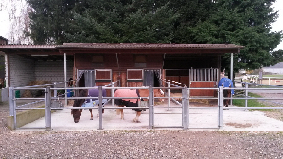 In unmittelbarer Nähe befindet sich der isolierte Weidestall mit den Ausläufen. Die Pferde können direkt vom Auslauf auf die Weide.