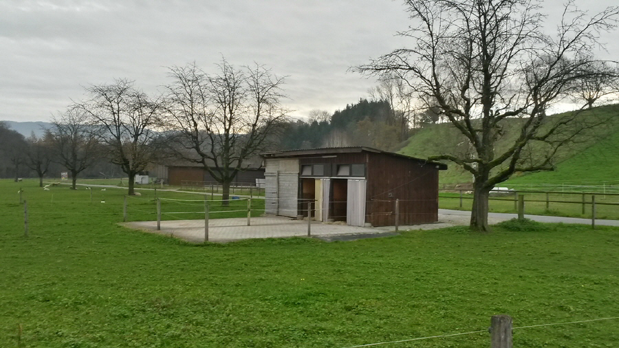 Etwa 40 Meter abgesetzt vom Hauptstall befindet sich der Tannenstall mit zwei Auslaufboxen. Auch dieser Stall ist isoliert, wodurch auch im Sommer ein angenehmes Klima herrscht.